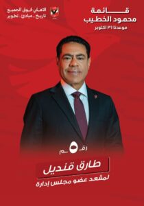 كشف طارق قنديل، عضو مجلس إدارة النادي الأهلي ومدير عام اول المصرف العربي الدولي، عن ترشحه لعضوية مجلس إدارة النادي ضمن قائمة الكابتن محمود الخطيب في انتخابات الأهلي المقرر عقدها يوم 31 أكتوبر 2025، تحت شعار «تكملة المشوار.. تنمية واستثمار».